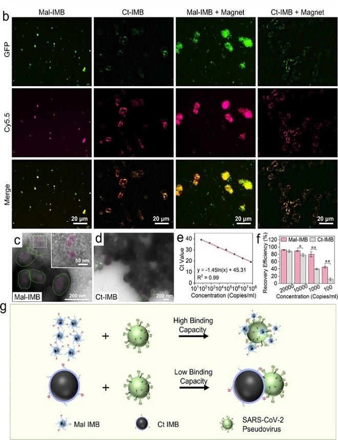 图. 超小Mal-IMB 免疫磁珠展现出高效磁富集COVID-19性能及其机理示意图