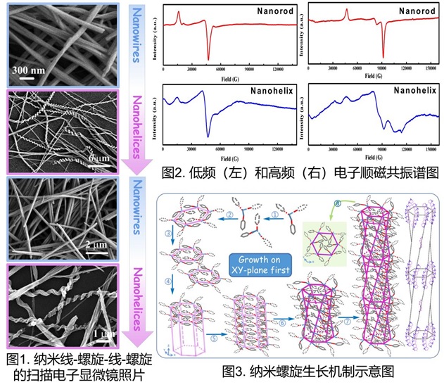 南京大学陆轻铱教授&高峰教授课题组,与中国科学院合肥物质院强磁场中心、中国科学技术大学合作,依托稳态强磁场实验装置(SHMFF),发现一种晶体结构中微妙的竞争和协作关系,在螺旋和解旋产物晶体结构之间建立了微妙的能量平衡,首次实现了纳米线与纳米螺旋之间的多重可逆变化(图1)。电子顺磁共振(ESR,包括高场ESR)(图2)证明纳米螺旋中Co(II)配位环境的变化以及对称性的降低。固体核磁共振谱和太赫兹谱表明π-π相互作用是螺旋生长中的关键作用力。结合理论计算和各种验证实验,推测出螺旋机制来源于缩合反应和π-π堆积过程之间的竞争作用(图3),这种独特的竞争生长机制以及生长方式的微观可调性,是构建细致可调的能量平衡体系、实现螺旋可逆变化的关键。针对性地设计改变分子间作用力,精细调控不同方向生长速度,使整体结构保持不变,能量平衡方向定向改变,成功实现了纳米结构的螺旋、解旋和再螺旋。