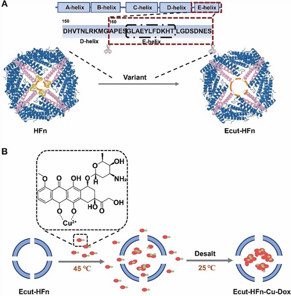 人源铁蛋白通过自组装形成均一稳定的纳米笼,在过去的几十年里,利用其独特的天然靶向能力和纳米笼结构,已经被广泛用于药物分子、成像剂、核酸等的装载,并用于多种疾病的诊断和治疗。然而,目前已提出的铁蛋白药物装载策略步骤复杂,反应条件较为苛刻(如高温、强酸/碱等),导致药物装载率和蛋白质回收率较低,限制了铁蛋白纳米药物的临床应用。