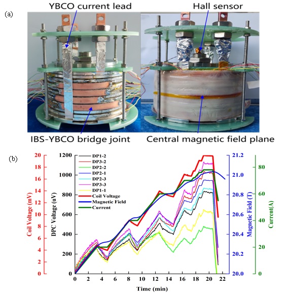 图:(a)铁基超导高场内插线圈;(b)内插线圈在20T背景场下励磁实验结果