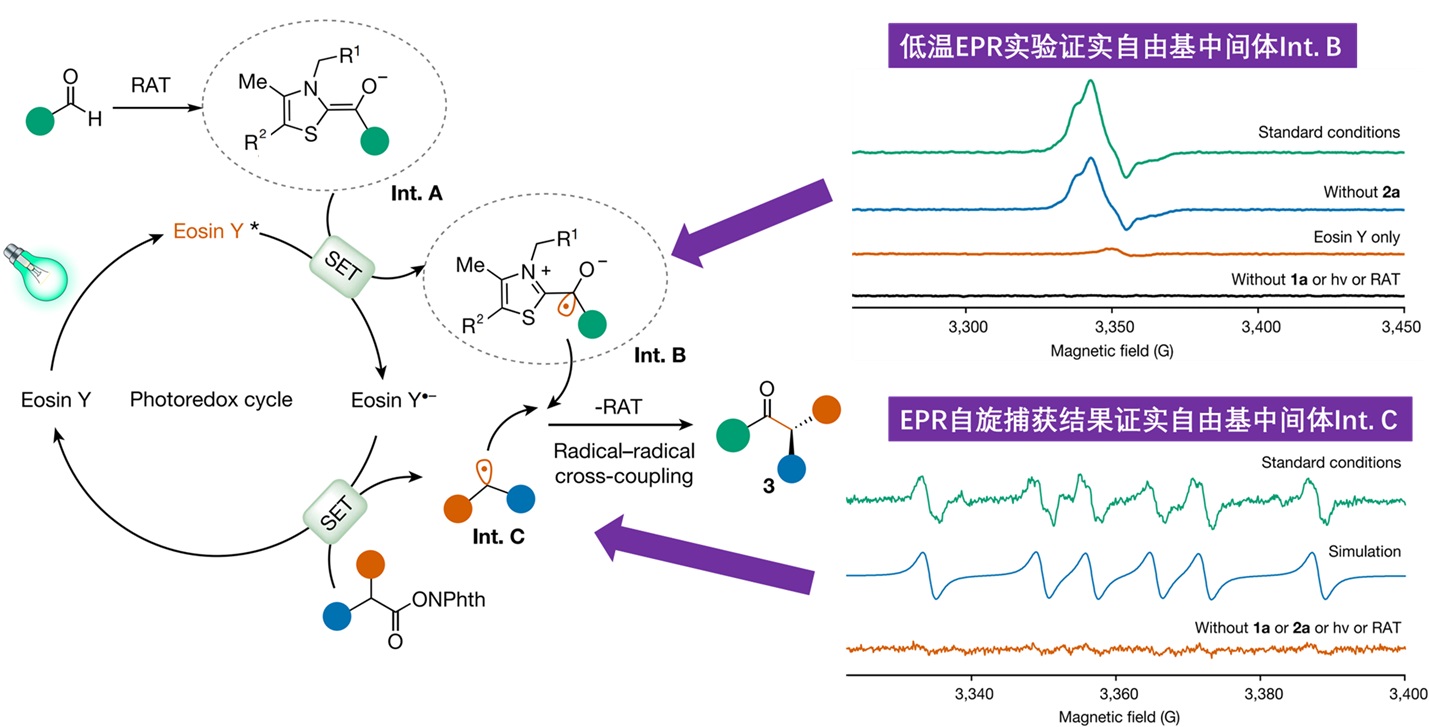 近期,稳态强磁场实验装置(SHMFF)用户中国科学院合肥物质院强磁场科学中心、安徽省高场磁共振成像重点实验室田长麟团队与南京大学黄小强团队、梁勇团队合作,在光酶催化研究领域取得重要进展。针对合作团队开发的焦磷酸硫胺素(ThDP)依赖酶和光催化协同的双催化新体系,田长麟团队依托SHMFF所属电子顺磁共振(Electron Paramagnetic Resonance, EPR)鉴定了催化反应中的自由基中间体及电子转移机制,研究成果以“A light-driven enzymatic enantioselective radical acylation”为题,于2023年12月18日在线发表在Nature杂志上。