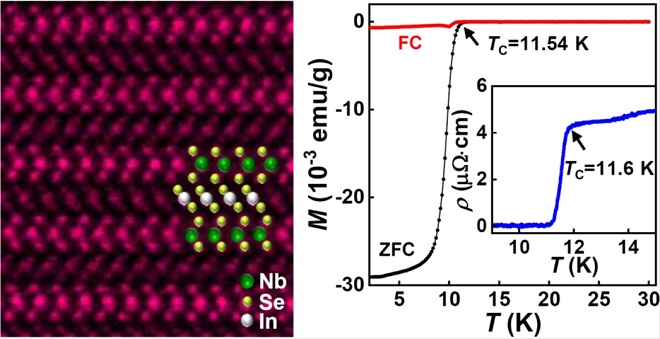 研究团队发现,在NbSe2材料的范德瓦尔斯层中插入InSe2,可以获得一种具有独特晶格结构的(InSe2)xNbSe2材料。团队通过X射线衍射、物性和磁性测试系统、高分辨能谱分析、原子分辨高角度环形暗场像差校正扫描透射显微镜等综合手段确定了该材料的结构(图1)。该材料表现出转变温度高达11.6 K的超导电性,这是目前已知的具有最高超导转变温度的过渡族金属硫化物超导体。进一步对该材料的临界电流密度进行了测量,发现其临界电流密度可达8.2x105 A/cm2,这个临界电流密度可以和铜氧化物和铁基超导体相媲美,表明该材料具有重要的潜在应用价值。