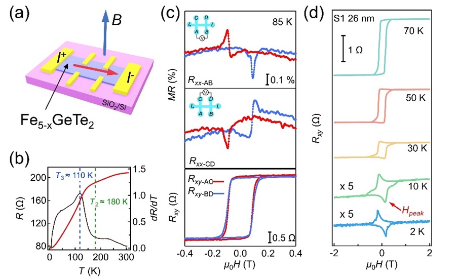 图1 (a) 微纳器件示意图,(b) Fe5-xGeTe2微纳器件的电阻值及温阻系数随温度依赖性,(c) 85 K的纵向磁阻(MR)和霍尔电阻(Rxy),(d)非常规霍尔效应。