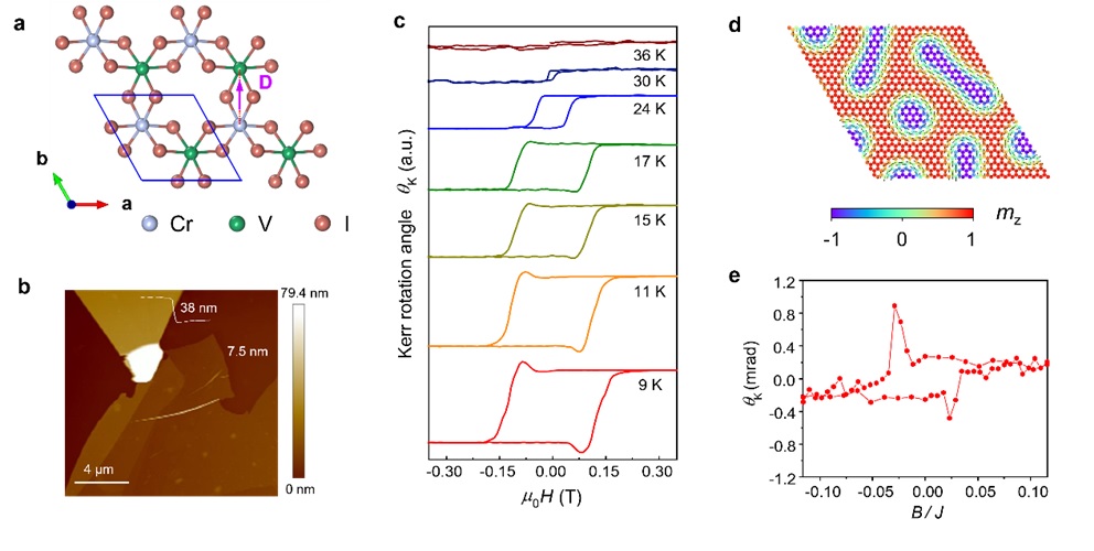 图1. 展示与凝练“拓扑克尔效应”的材料体系与物理过程。(a)CrVI6的空间反演对称破缺晶体结构。(b)薄层样品原子力显微形貌图。(c)不同温度下的磁光克尔回线,低温下的信号系统展现奇异反对称“凸起”。(d)CrVI6的Kondo晶格模型,在磁场辅助下形成的点状和条带状磁斯格明子。(e)理论计算的磁光克尔回线。