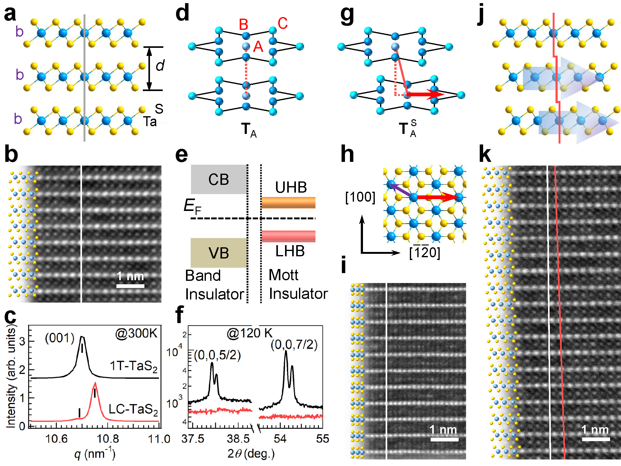 研究团队另辟蹊径,在1T-TaS2单晶中创造了周期性的层间横向滑移,并首次使用“阶梯状堆叠构型”(laddering configuration, LC)对这种新的人工结构进行了命名。通过引入微小的晶格层间滑移(0.15Å,见图k扫描电镜结果),成功地对层间相互作用进行单调调制(X射线衍射结果,图f)。光电子能谱、扫描隧道显微镜和角分辨光电子能谱等谱学研究结果证实滑移前后费米面附近的电子平带和带隙等微观电子结构的演变,完全符合理论计算预期。