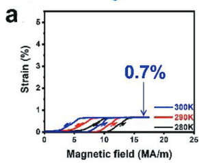 该研究团队基于稳态强磁场实验装置所属水冷磁体WM5,系统研究了Ni34Co8Cu8Mn36Ga14单晶在磁场作用下的电输运和磁致弹性应变效应。通过电输运测量,证明了该单晶可由磁场驱动发生结构转变。应变研究表明,生长态单晶的磁致弹性应变仅为0.7%(图a)。研究团队通过40 MPa的压应力对单晶进行了应力约束相变循环(SCTC)训练,引入有序位错阵列。之后,移出施加的外部压应力,在自由态单晶中,检测到应变高达5%的巨大磁致超弹性效应(图b)。基于Ni34Co8Cu8Mn36Ga14单晶的巨大磁致超弹性效应,设计了脉冲磁场驱动器件,实验表明,Ni34Co8Cu8Mn36Ga14单晶的磁致超弹性效应具有对磁场的快速响应特点。