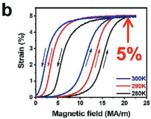 现代工程技术,如行程控制、换能驱动、精密加工、能量收集等,都需要高性能的驱动、换能和传感器件。如果材料在磁场作用下能够输出可恢复的弹性应变,将有利于其在高性能器件中的无接触工作。传统的磁致伸缩材料,其磁致弹性应变仅0.2%。磁驱动形状记忆材料,基于磁场驱动结构转变,具有输出巨大磁致超弹性应变的潜力。然而,目前报道,在无约束的自由状态下,磁驱动形状记忆材料的磁致弹性应变小于0.6%。在预压力约束下,磁致弹性应变可达3%,但由此导致器件结构复杂,应用受限。在自由状态下,仅由磁场诱发的巨大磁致超弹性效应未见报道。