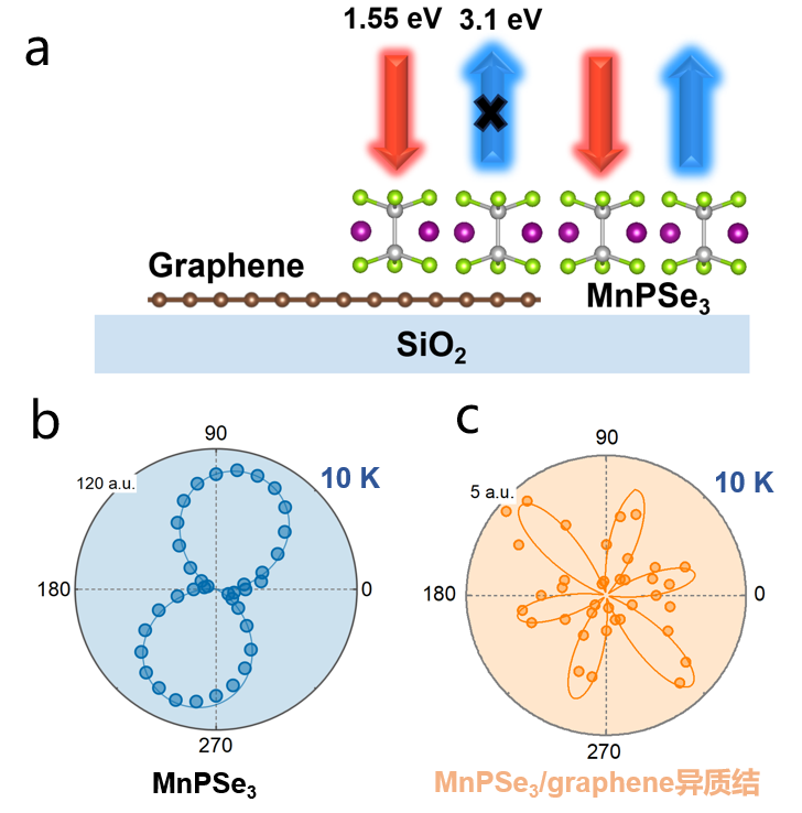 图1. 非线性SHG实验示意图(a)、MnPSe3(b)和MnPSe3/graphene(c)异质结的SHG信号