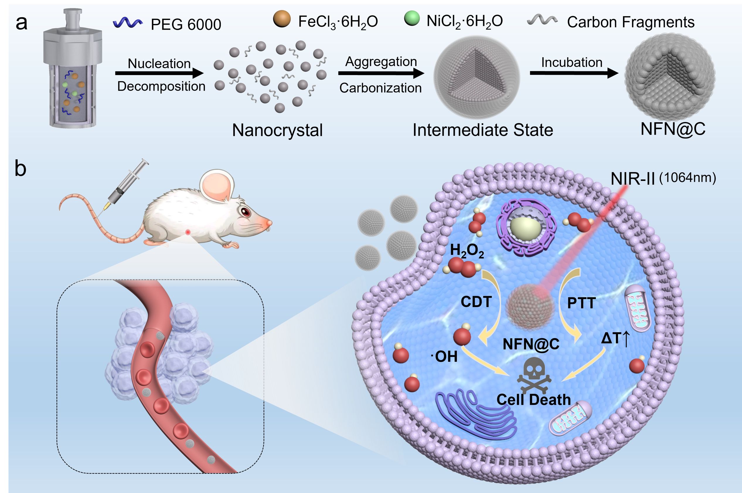 图 1. NFN@C催化剂的合成及肿瘤催化治疗示意图。