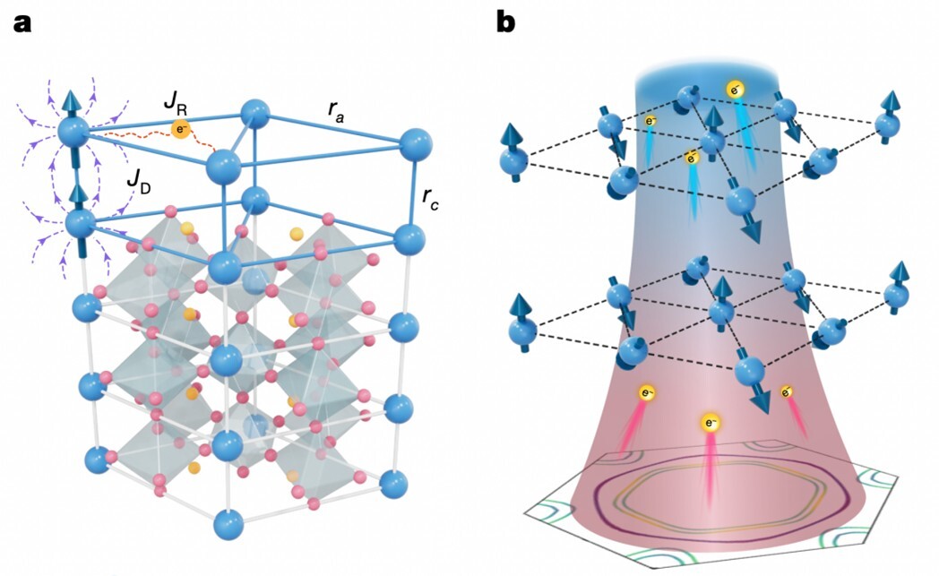 图2. a,ECA的晶格结构和相互作用,其中JR表示局域磁矩通过传导电子诱导的RKKY相互作用,提供面内自旋阻挫,JD是层间偶极相互作用,提供磁各向异性;b,局域磁矩形成自旋超固态,提供巨大熵变与制冷能力,传导电子提供热量的“高速通道”