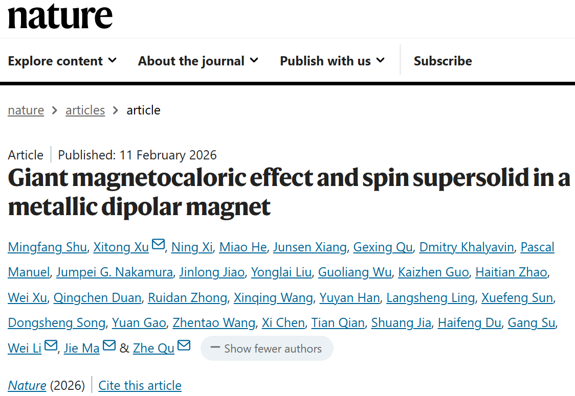 在中国科学院基础科学研究局的战略组织与推动下,来自中国科学院和高校等多个研究单位的理论和实验团队通力合作,集智攻关,依托稳态强磁场实验装置(合肥)、综合极端条件实验装置(怀柔)、上海光源以及英国散裂中子源、日本物质·生命科学实验设施等国内外大科学装置,通过基础研究源头创新驱动极低温制冷的颠覆性新技术发展。研究成果于2026年2月11日以“Giant magnetocaloric effect and spin supersolid in a metallic dipolar magnet”为标题发表在国际期刊Nature [1],并已获中国发明专利授权[7]。Nature审稿人高度评价本工作中发现的金属自旋超固态材料“同时具备适用于100毫开尔文温区的绝热去磁制冷能力与优异的电导(及热导)性能,这一特性组合是独一无二的”;“除了实际应用潜力,该材料还被提出可作为自旋超固态的候选体系,为基础物理研究与技术应用领域均带来了引人注目的启示。”