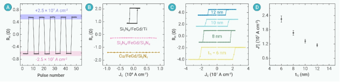 研究团队构建了由轻金属钛(Ti)与稀土-过渡金属亚铁磁体Fe₁₋ₓGdₓ组成的Ti(10nm)/Fe0.70Gd0.30(10nm)异质结构薄膜,首次证实:仅借助 3d 轻金属 Ti 提供的轨道流,即可成功诱导亚铁磁垂直磁化的完全翻转。面外磁滞回线与反常霍尔回线结果均显示Fe0.70Gd0.30具有非常强的垂直磁各向异性。在面内磁场(HX=±40 mT)辅助下,施加连续脉冲电流即可实现两个垂直易磁化态的确定性翻转。其临界翻转电流密度约为1.5×107 A cm-2,这一数值与典型重金属(如Pt等)体系处于同一量级(图2)。连续多次脉冲循环后,霍尔信号幅值几乎不变,验证了翻转的稳定性与耐久性。这一结果直接证明了轻金属 Ti 是高效的轨道源材料,无需任何传统重金属即可驱动垂直磁化翻转。