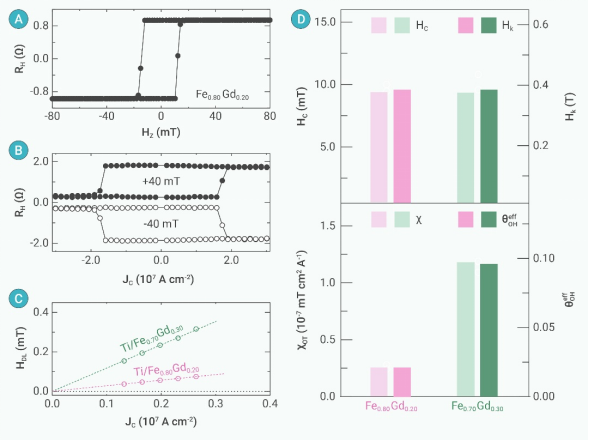 最后,为探究轨道转矩与磁性层自旋轨道耦合(SOC)的内在关联,研究团队通过调节Gd含量来调控Fe1-xGdx亚铁磁合金的磁性和自旋轨道耦合(SOC)强度,设计了 Ti/Fe0.70Gd0.30与Ti/Fe0.70Gd0.20 两种异质结构薄膜进行对照实验。尽管两者具有几乎相同的矫顽场(HC)、各向异性场(HK)和饱和磁化强度(MS),但Gd含量更高的Fe0.70Gd0.30具有更强的SOC。实验测得前者的轨道转矩效率较后者提高约 4 倍,临界翻转电流降低约 25%,直接验证了轨道转矩效率随磁性层SOC 增强而增大的内在规律(图5)。此外,进一步的对比研究证实了磁性层SOC对轨道转矩效率的决定性作用:在 Ti/CoFeB/MgO(其SOC可忽略)结构中未观测到翻转,而在Ti/[Co/Pt]₃(其具有强SOC)结构中则可在低至 6×10⁶ A cm⁻² 的电流密度下完成翻转,有效轨道霍尔角高达0.4。