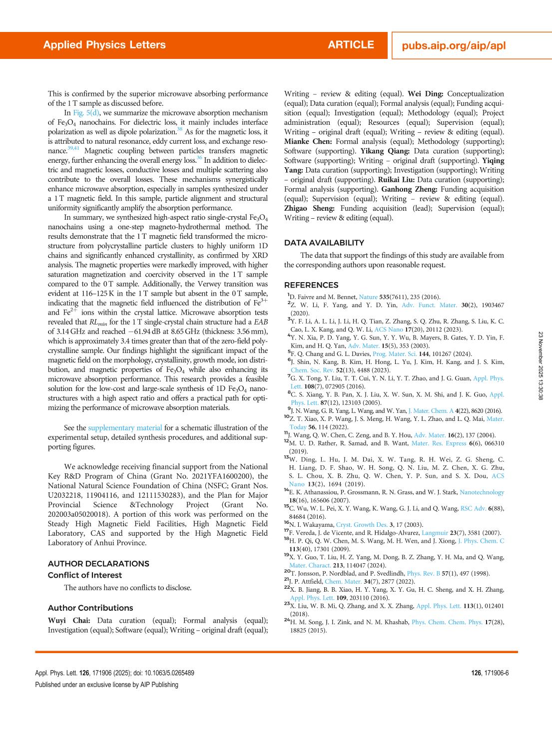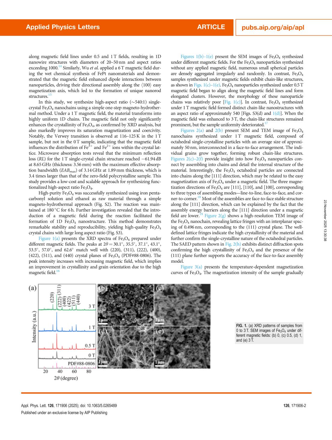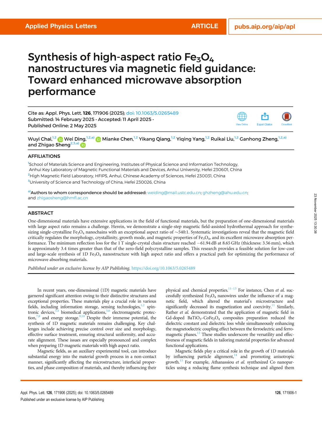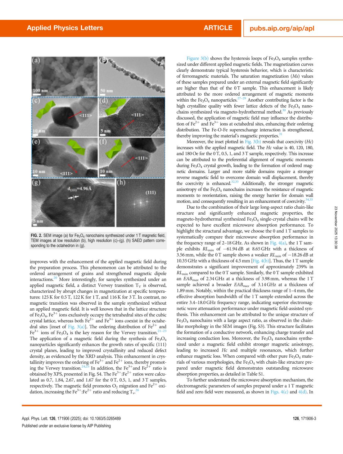 Synthesis of high-aspect ratio Fe3O4 nanostructures via magnetic field guidance: Toward enhanced microwave absorption performance